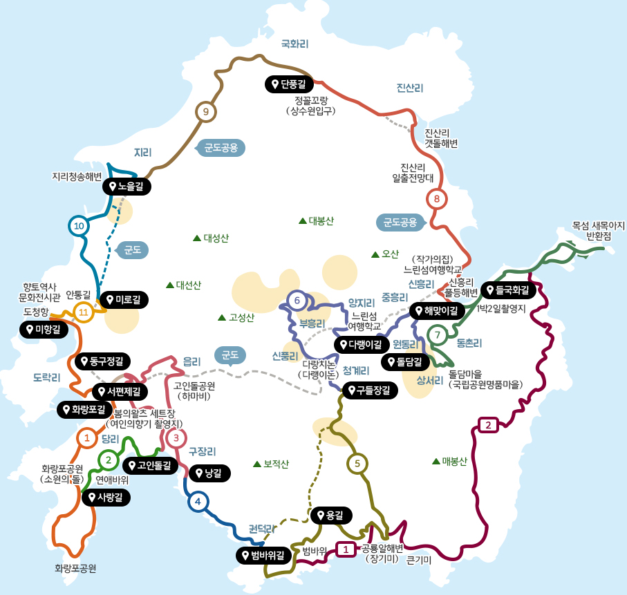 청산도 슬로길은 청산도 주민들의 마을 간 이동로로이용되던 길로써 아름다운 풍경에 취해 절로 발걸음이 느려진다하여 슬로길이라 이름 붙여졌으며2010년 전체 11코스(17일) 42.195km에 이르는 길이 열렸습니다.길이 지닌 풍경, 길에 사는 사람, 길에 얽힌 이야기와 어우러져 거닐 수 있도록 각 코스를 조성한 것이 가장 큰 특징으로2010년 문화체육관광부 이야기가 있는 생태탐방로로 선정, 2011년 국제슬로시티연맹 공식인증 세계슬로길 1호로 지정되는 등길이 지닌 아름다움을 대외적으로 인정받았습니다.